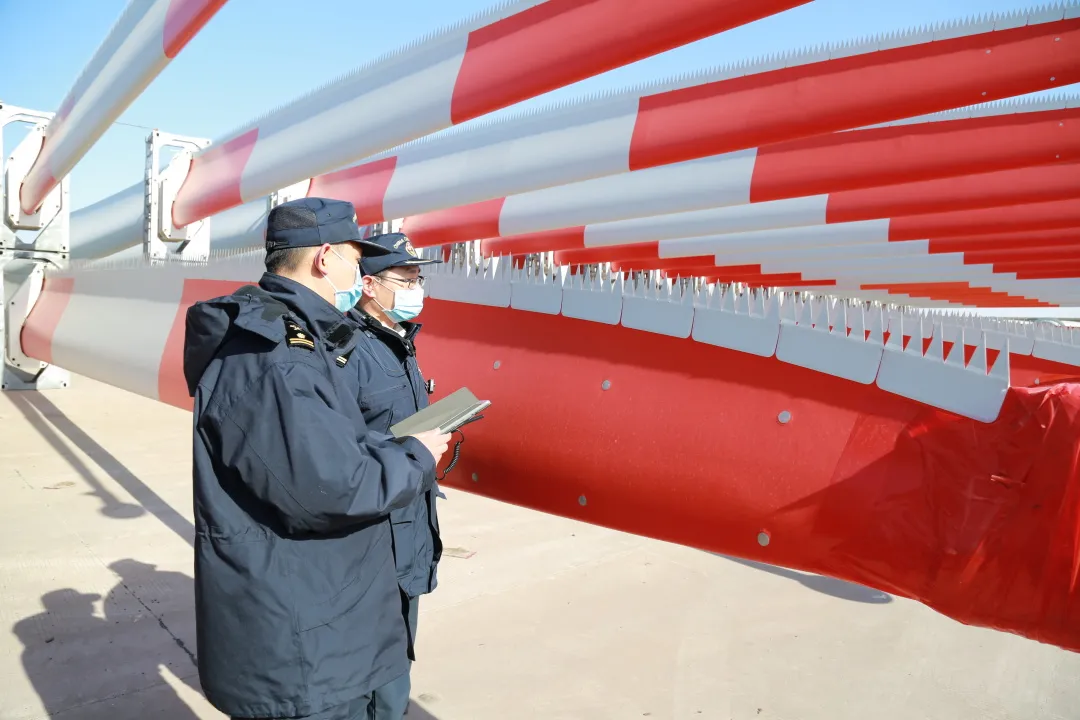 圖為:鹽城海關關員對“滬豐通”搭載的出口風電葉片進行查驗