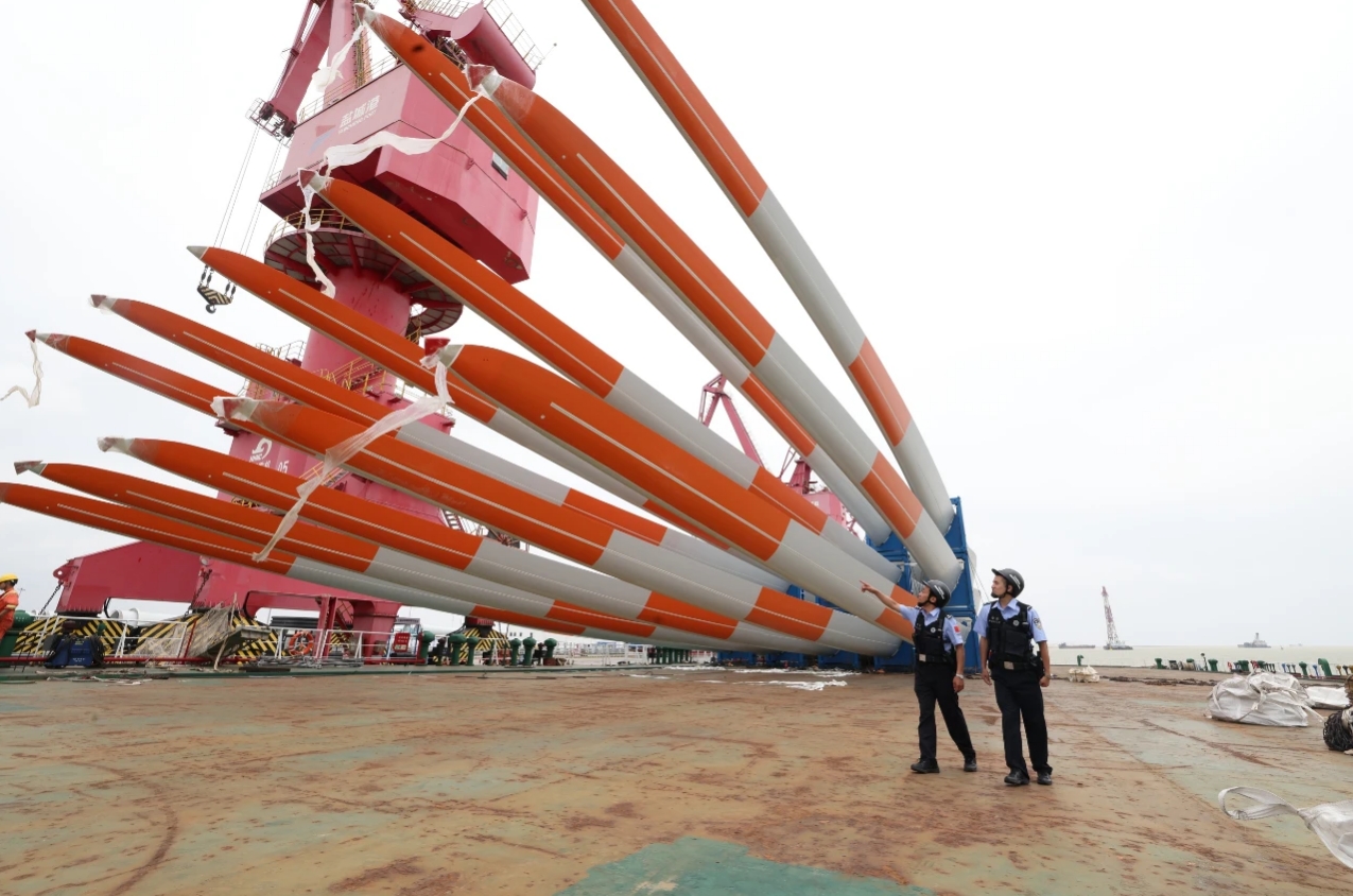風能是一種清潔可再生能源,風力發電近年來越發受到世界各國重視。鹽城港作為華東地區大型國產風電葉片的主要出口港之一,風電葉片主要出口到共建“一帶一路”國家。此次共起運20套60件風電葉片及其附屬配件,其中葉片長75.8米,貨物總體積超6萬余立方米,總價值約6000萬元,是中國專門為國際市場(印度)需求研發的陸上風電設備。據鹽城出入境邊防檢查站統計,2024年鹽城港射陽港區累計完成風電裝備裝卸量936.85萬噸,同比增長23.67%,外貿風電完成19.01萬噸,同比增長100%。
