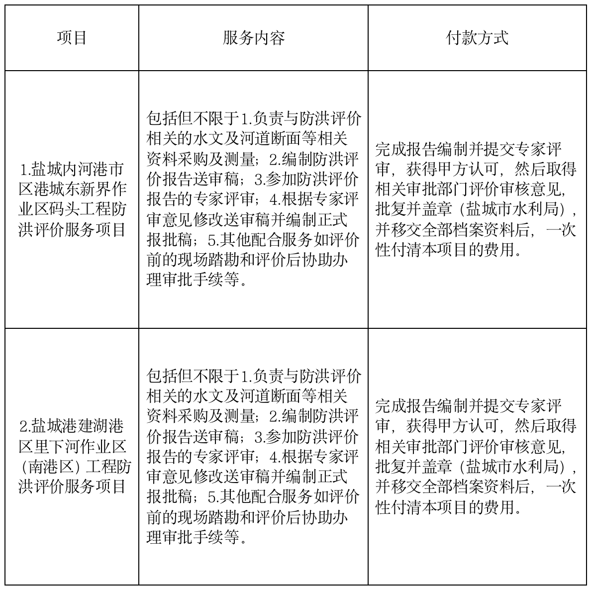 一、江蘇鹽城港水上服務投資發展有限公司就鹽城內河港市區港城東新界作業區碼頭工程及鹽城港建湖港區里下河作業區(南港區)工程防洪評價服務項目進行公開招標,歡迎符合條件的潛在投標人前來報名參加。