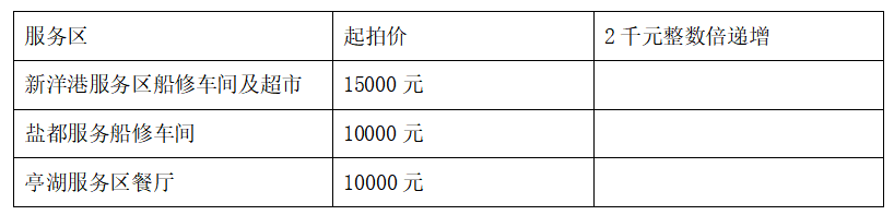 競拍形式:公開競拍,拍租期限為1年,每個服務區的競拍按起拍價,2千元整數倍遞增(如2000、4000、6000、8000……)。如下表: