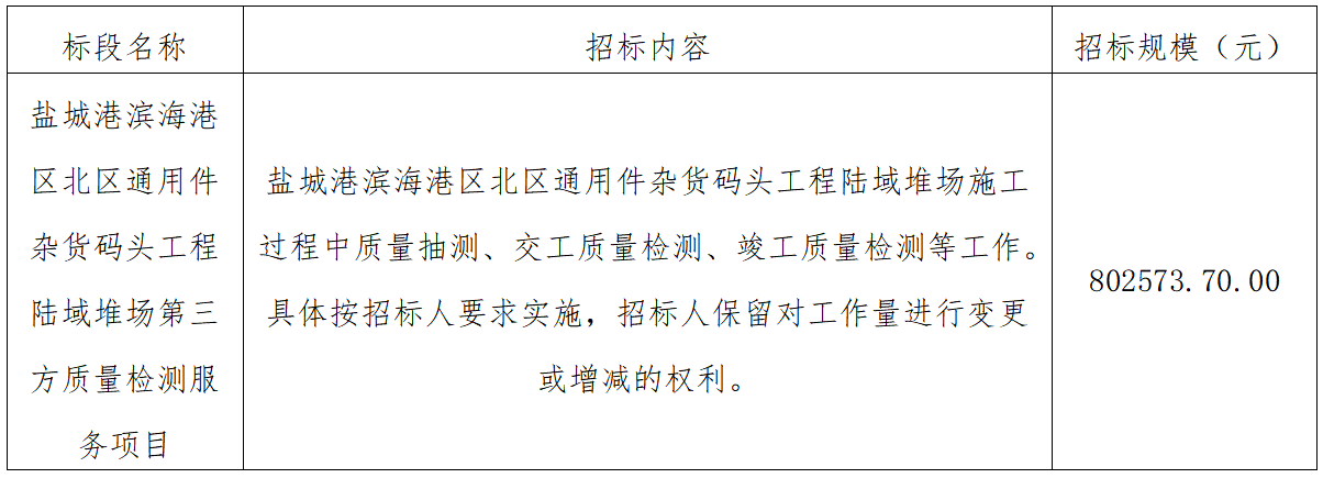一、江蘇鹽城港濱海港開發(fā)集團有限公司負責實施的鹽城港濱海港區(qū)北區(qū)通用件雜貨碼頭工程陸域堆場第三方質(zhì)量檢測服務項目已具備招標條件,項目所需資金已落實,現(xiàn)通過公開招標方式邀請潛在投標人參加本項目的投標。