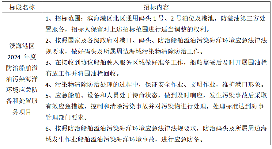 1、項目名稱:濱海港區(qū) 2024 年度防治船舶溢油污染海洋環(huán)境應急防備和處置服務項目