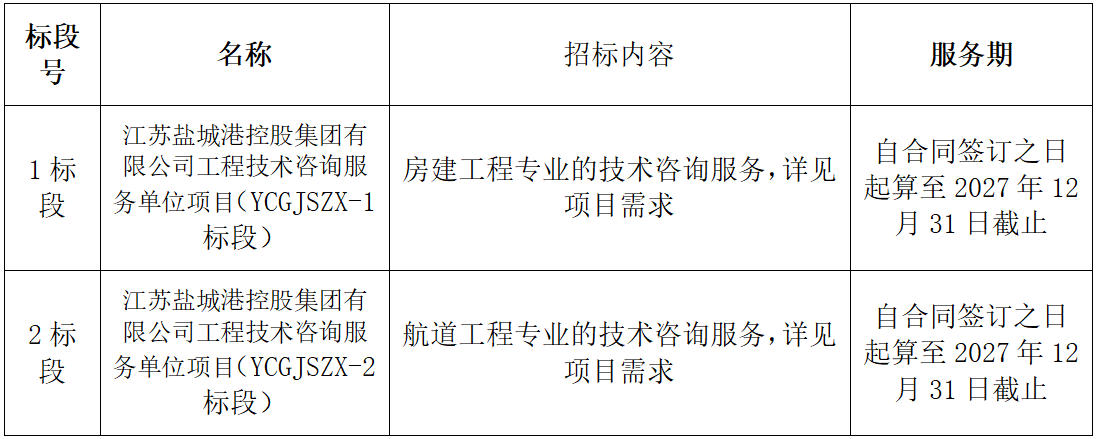 江蘇鹽城港控股集團(tuán)有限公司因工作需要,現(xiàn)通過公開招標(biāo)方式,選擇技術(shù)咨詢服務(wù)單位,請(qǐng)潛在的投標(biāo)人參加本服務(wù)采購(gòu)的投標(biāo)報(bào)名,現(xiàn)就有關(guān)事項(xiàng)公告如下。
