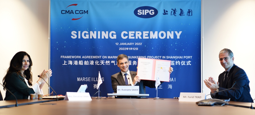 上海國際港務(集團)股份有限公司(“上港集團”)與法國達飛海運集團(“達飛集團”)于2022年1月12日舉行了上海港船舶液化天然氣(LNG)加注服務項目框架協議簽約儀式,上港集團董事長顧金山與達飛集團董事長、首席執行官魯道夫·薩德出席。
