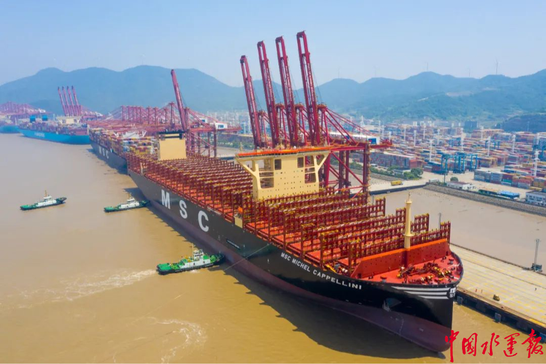 我國(guó)自主研制的超大型集裝箱船“地中海米歇爾卡佩里尼”輪首航首站靠泊寧波舟山港穿山港區(qū)集裝箱碼頭4號(hào)泊位