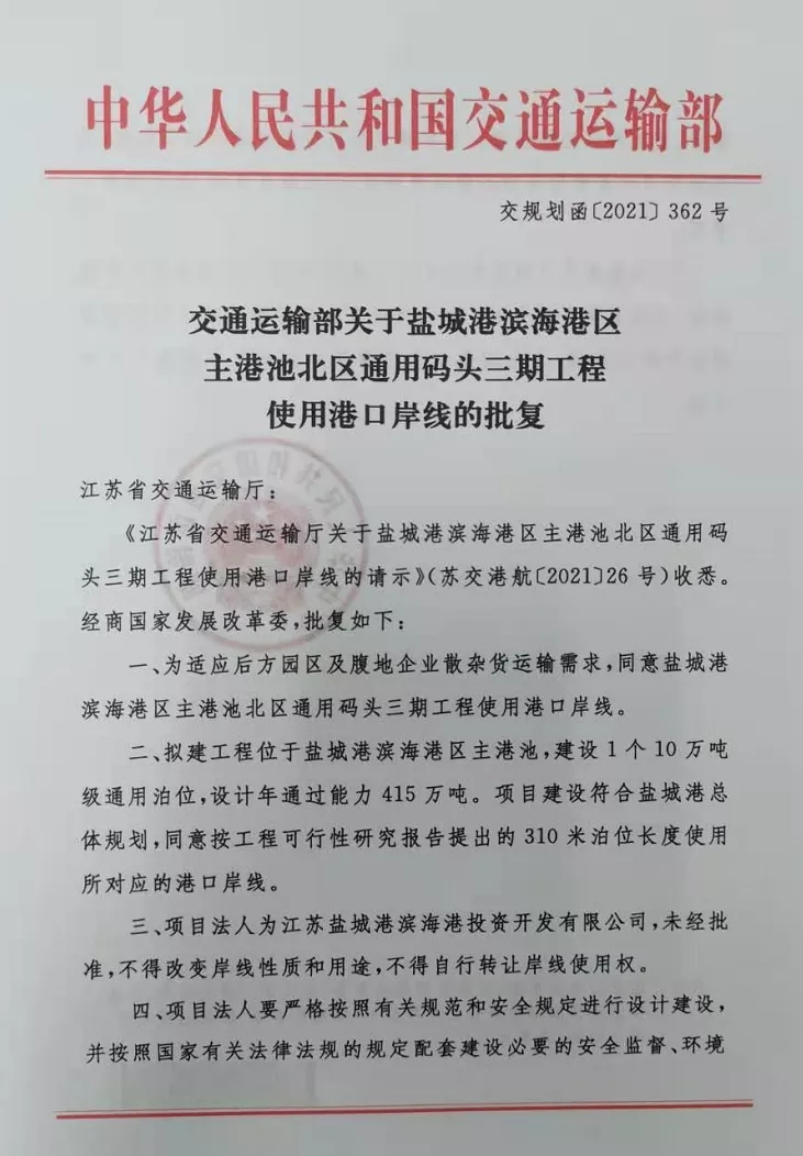 近日,交通運輸部批復鹽城港濱海港區主港池北區通用碼頭三期工程使用港口岸線的請示(交規劃函〔2021〕362號)、省發展改革委批復鹽城港濱海港區北港池防波堤一期工程可行性研究報告(蘇發改基礎發〔2021〕672號),標志濱海港區重大項目前期工作取得突破性進展。