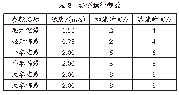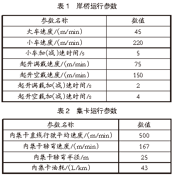 堆場(chǎng)仿真參數(shù):2.1 堆場(chǎng)布局參數(shù)港口裝卸作業(yè)區(qū)布置2個(gè)10萬(wàn)噸級(jí)泊位,每個(gè)泊位配備3臺(tái)岸橋,總計(jì)6臺(tái)岸橋,編號(hào)分別為Crane 1、Crane 2、Crane 3、Crane 4、Crane 5、Crane 6。港口堆場(chǎng)作業(yè)區(qū)規(guī)劃有4個(gè)箱區(qū),編號(hào)分別為E01、E02、E03、E04。在堆場(chǎng)布置方面,E01箱區(qū)為近海側(cè)箱區(qū),E04箱區(qū)為近陸側(cè)箱區(qū),E01、E02箱區(qū)為出口箱區(qū),E03、E04箱區(qū)為進(jìn)口箱區(qū)。在港口堆場(chǎng)作業(yè)區(qū)規(guī)劃中,將E01箱區(qū)設(shè)置為9列5層箱區(qū),E02、E03、E04箱區(qū)設(shè)置為12排5層箱區(qū),每個(gè)箱區(qū)配備有2臺(tái)場(chǎng)橋協(xié)同作業(yè),總計(jì)8臺(tái)場(chǎng)橋,編號(hào)分別為A01、A02、A03、A04、A05、A06、A07、A08。2.2 堆場(chǎng)設(shè)備參數(shù)港口堆場(chǎng)作業(yè)設(shè)備主要包括場(chǎng)橋、岸橋、集卡等,上述設(shè)備的運(yùn)行參數(shù)即為堆場(chǎng)仿真系統(tǒng)的輸入?yún)?shù)。根據(jù)實(shí)際集裝箱堆場(chǎng)作業(yè)數(shù)據(jù),對(duì)作業(yè)設(shè)備進(jìn)行參數(shù)設(shè)置。岸橋運(yùn)行參數(shù)見(jiàn)表1,集卡運(yùn)行參數(shù)見(jiàn)表2,場(chǎng)橋運(yùn)行參數(shù)見(jiàn)表3。