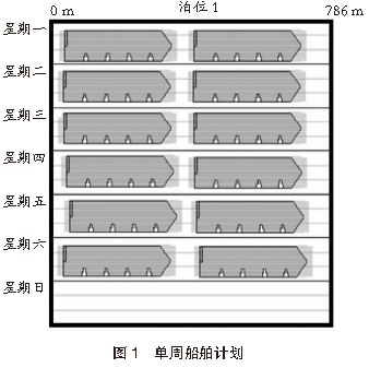 2.3 船舶泊位參數(shù)根據(jù)港口提供的實(shí)際船舶和泊位規(guī)格參數(shù),建立船舶精確模型和簡(jiǎn)化模型,具體模型按照現(xiàn)場(chǎng)作業(yè)需求和仿真系統(tǒng)實(shí)際運(yùn)行情況進(jìn)行選擇。為了對(duì)港口堆場(chǎng)作業(yè)進(jìn)行有效的仿真分析,在設(shè)置泊位參數(shù)時(shí),優(yōu)先考慮實(shí)際作業(yè)過(guò)程中最大泊位通過(guò)能力。按照單周作業(yè)計(jì)劃進(jìn)行工況設(shè)定,單周計(jì)劃作業(yè)船舶12艘,單艘船舶裝箱量為420~ 530 TEU,卸箱量為420~530 TEU。單周船舶計(jì)劃見(jiàn)圖1。