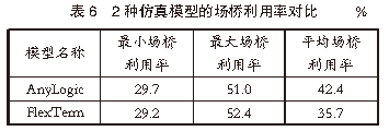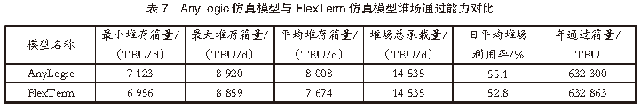 經(jīng)綜合分析發(fā)現(xiàn),無(wú)論是單一場(chǎng)橋利用率還是平均場(chǎng)橋利用率,AnyLogic仿真模型的數(shù)據(jù)結(jié)果都普遍高于FlexTerm仿真模型的數(shù)據(jù)結(jié)果。通過(guò)分析堆場(chǎng)作業(yè)系統(tǒng)仿真流程發(fā)現(xiàn),上述差異是由2種仿真模型的作業(yè)指令生成模式不同導(dǎo)致的。在相同的作業(yè)時(shí)段內(nèi),AnyLogic仿真模型的作業(yè)指令生成的作業(yè)數(shù)量要高于FlexTerm仿真模型的作業(yè)指令生成的作業(yè)數(shù)量,從而導(dǎo)致AnyLogic仿真模型的場(chǎng)橋利用率高于FlexTerm仿真模型的場(chǎng)橋利用率。根據(jù)港口提供的數(shù)據(jù),全年該港口自動(dòng)化堆場(chǎng)的場(chǎng)橋利用率在40%~60%?;贏nyLogic仿真模型和FlexTerm仿真模型仿真得到的平均場(chǎng)橋利用率分別為42.4%、35.7%。顯然,與FlexTerm仿真模型的仿真結(jié)果相比,AnyLogic仿真模型的仿真結(jié)果同實(shí)際作業(yè)數(shù)據(jù)的統(tǒng)計(jì)結(jié)果更接近。究其原因,這是由2款仿真模型的集裝箱裝卸作業(yè)指令的生成模式不同導(dǎo)致的。對(duì)堆場(chǎng)作業(yè)系統(tǒng)仿真流程分析發(fā)現(xiàn):在AnyLogic仿真模型中,集裝箱裝卸作業(yè)指令是根據(jù)港口歷史數(shù)據(jù),借助算法計(jì)算生成的,比較接近港口的實(shí)際作業(yè)數(shù)據(jù);在FlexTerm仿真模型中,集裝箱裝卸作業(yè)指令是利用軟件自帶作業(yè)計(jì)劃模塊,通過(guò)配置船期、堆場(chǎng)計(jì)劃等參數(shù)自動(dòng)生成的,與港口實(shí)際作業(yè)數(shù)據(jù)之間存在一定的差距。4.2 堆場(chǎng)使用情況對(duì)比為了合理規(guī)劃堆場(chǎng)空間資源,根據(jù)港口提供的船期、堆場(chǎng)計(jì)劃等參數(shù),對(duì)港口堆場(chǎng)的使用情況進(jìn)行仿真對(duì)比分析。AnyLogic仿真模型與FlexTerm仿真模型堆場(chǎng)通過(guò)能力對(duì)比見(jiàn)表7。由表7可知,在相同輸入條件下,AnyLogic仿真模型和FlexTerm仿真模型仿真模擬得到的堆場(chǎng)利用情況和堆場(chǎng)通過(guò)能力基本一致。但由于泊位船舶計(jì)劃較為寬松,船期密度小于實(shí)際船期數(shù)據(jù),AnyLogic仿真模型和FlexTerm仿真模型的堆場(chǎng)通過(guò)箱量分別為632 300 TEU和632 863 TEU,均小于港口全年實(shí)際堆場(chǎng)通過(guò)箱量724 272 TEU。