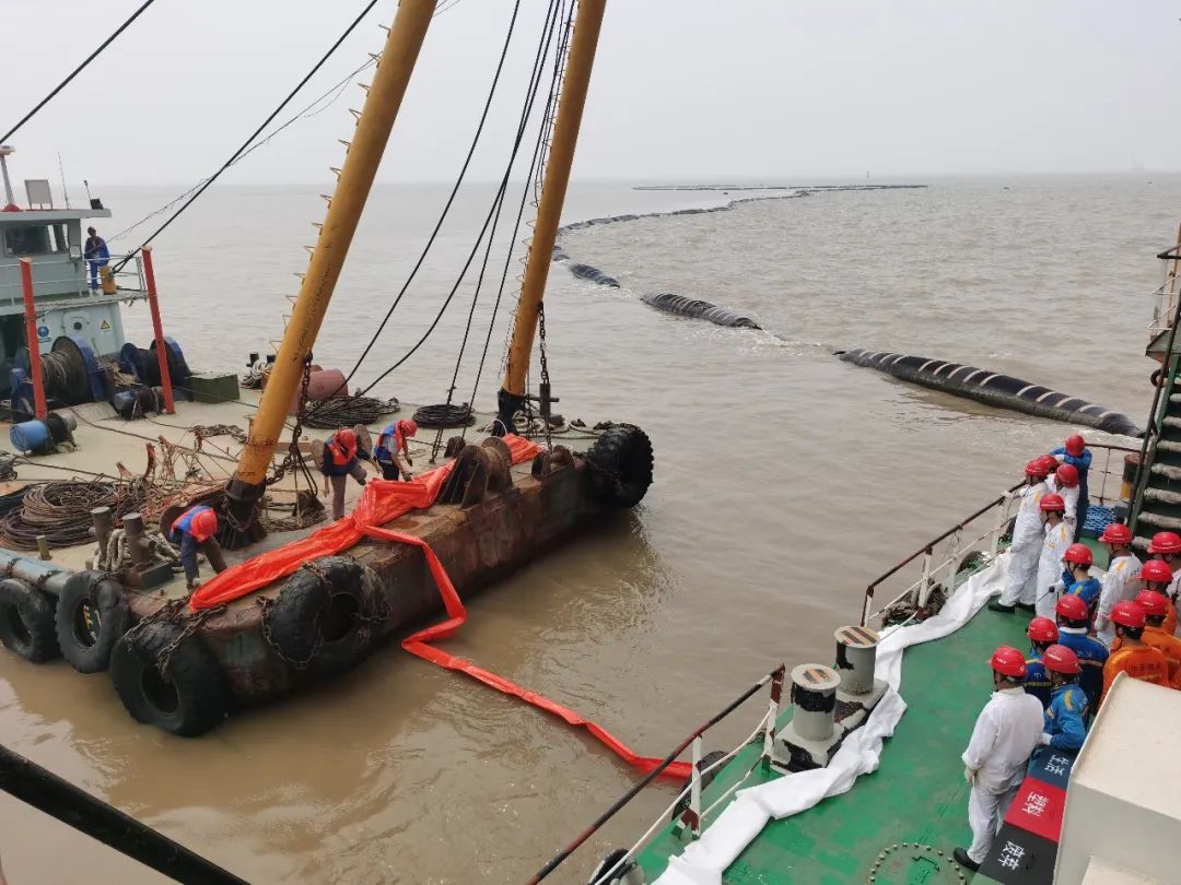 隨后,溢油演習(xí)正式開始,“左舷船中錨機壓管漏油啦!”“新海鯉”輪船長接報后立即拉響了防油污警報,同時船長通過全船廣播告知溢油地點,根據(jù)應(yīng)變部署要求,立即切斷漏油源頭,控制油污流入海面,清理甲板現(xiàn)場污油。同時上報施工項目部,項目部組織“航工301”、“茸洋168”、“海盛189”輪立即趕赴灌河口航道轉(zhuǎn)運點參與新海鯉輪的水面油污清理工作,通過各輪齊心協(xié)作,成功完成清污工作。