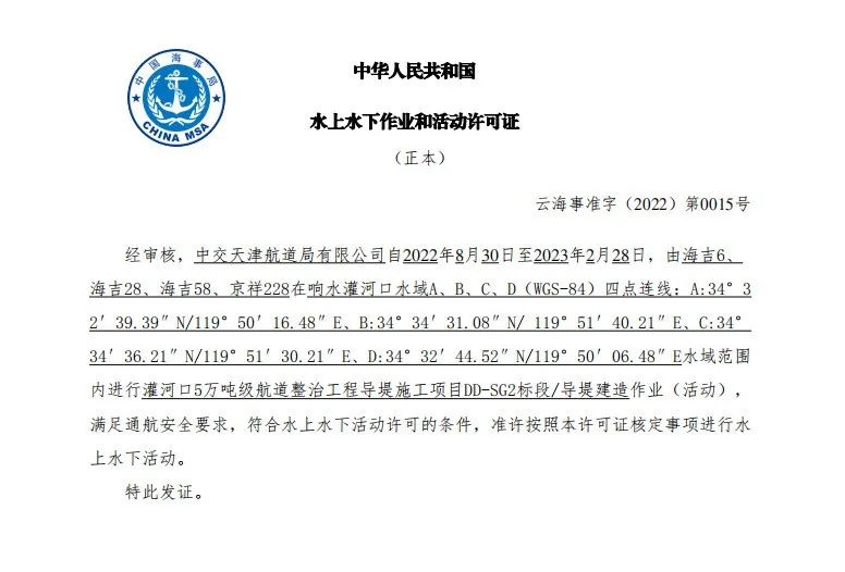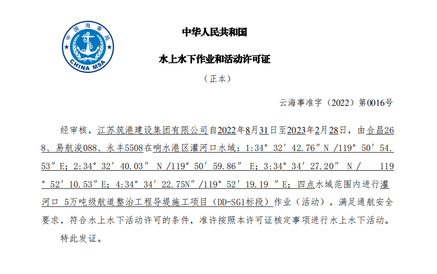 【項目大推進】鹽城港響水港區灌河口5萬噸級航道整治工程導堤施工項目獲批水上水下活動許可證