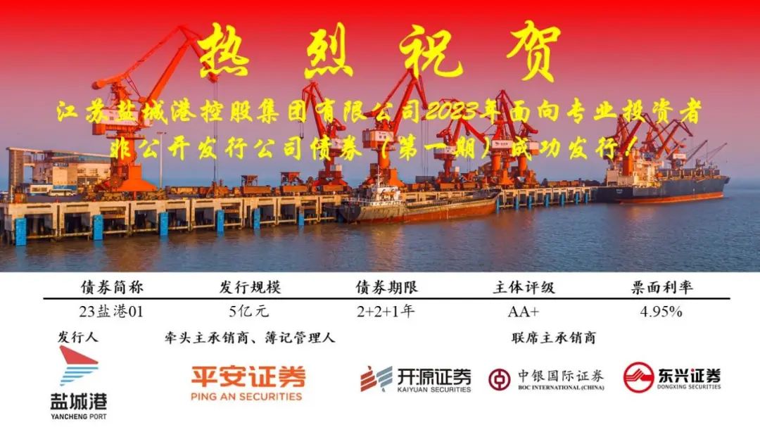 2月23日,鹽城港集團2023年度第一期私募公司債成功發(fā)行,金額5億元,發(fā)行利率4.95%。本期私募公司債為集團本部私募產品首次公開市場亮相,進一步提振了金融機構對鹽城港集團發(fā)展的信心,鞏固了集團在資本市場的口碑與信譽。