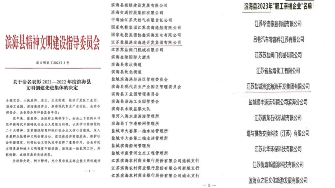 近日,濱??h總工會公示了提升職工生活品質(zhì)2021—2022年度縣文明創(chuàng)建先進集體、2023年濱海縣“職工幸福企業(yè)”名單,濱海港區(qū)再獲兩項榮譽。