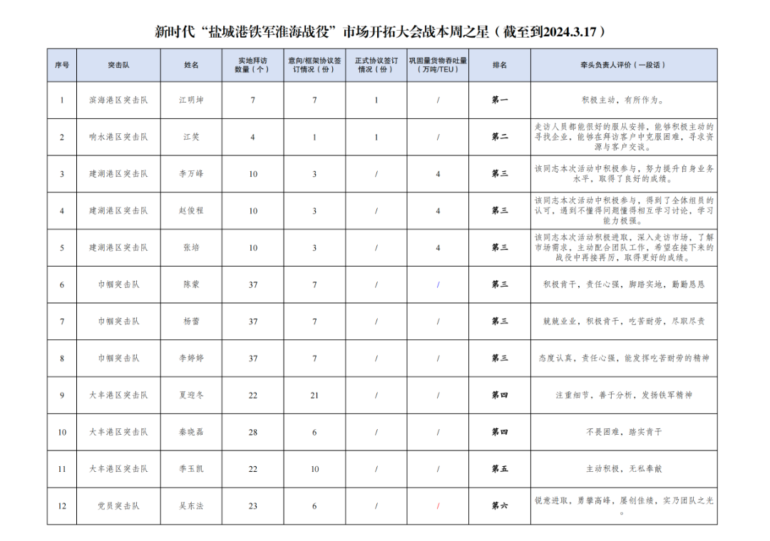 第一名:濱海港區(qū)突擊隊(duì) 江明坤(拜訪客戶7家,簽訂意向協(xié)議7份,簽訂正式協(xié)議1份)