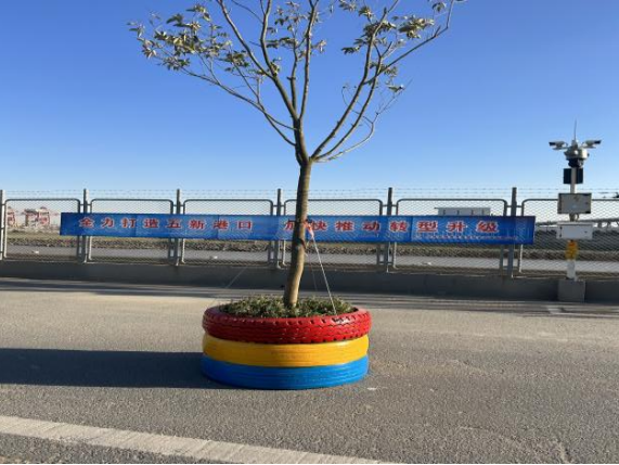針對地磅站臺位置地處碼頭邊緣的現狀,為有效防止車輛在運輸或掉頭拐彎過程中,誤闖碼頭或誤滑海域等安全隱患,開展“修舊利廢”行動,誤闖碼頭或誤滑海域等安全隱患,踐行“修舊利廢”行動,利用2套支座、4根Φ40的廢舊鋼絲繩,支座選用預埋定位螺栓,高標號水泥澆筑固定,制作一套安全防護車擋;利用廢舊輪胎循環制作路邊安全警示“盆景”;聚焦修舊利廢“小舉措” 實現提質增效“大提升”。