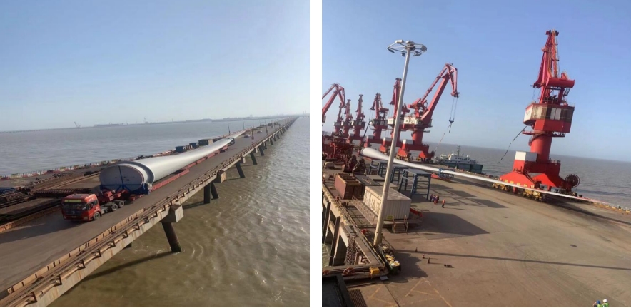 近日,在鹽城港大豐港區通用碼頭2#泊位上演了一場風電葉片的吊裝大片。兩套116米巨龍般的風電葉片,隨著吊裝繩索穩穩吊放在“盛達98”輪甲板上,標志著本次風電葉片作業任務順利完成,起航運往廣西防城港。