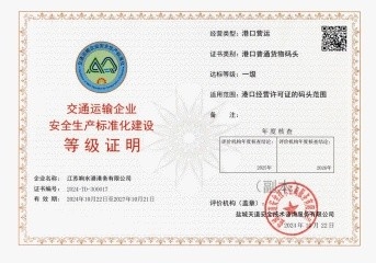 近日,鹽城港響水港區(qū)順利通過交通運輸企業(yè)安全生產(chǎn)標準化達標認證考核,喜獲“交通運輸企業(yè)安全生產(chǎn)標準化建設一級證書”。響水港區(qū)在安全生產(chǎn)管理體系精細化、規(guī)范化、標準化建設方面邁入新的發(fā)展階段,為推動港口安全生產(chǎn)工作再上新臺階奠定了堅實基礎。