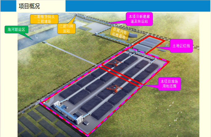 該項目陸域用地面積25.03萬㎡,其南北向縱深約736.83米,東西向?qū)挾葎t約為318.97米。作為大豐港區(qū)重點工程的一部分,該項目從二期散貨堆場已建的T6轉(zhuǎn)運站預(yù)留的2路皮帶機接口延伸而來,旨在通過T6轉(zhuǎn)運站皮帶機的延伸及大豐港現(xiàn)有臨時堆場用地范圍內(nèi)相應(yīng)配套設(shè)施的建設(shè),進一步提升港口的功能性和效率。