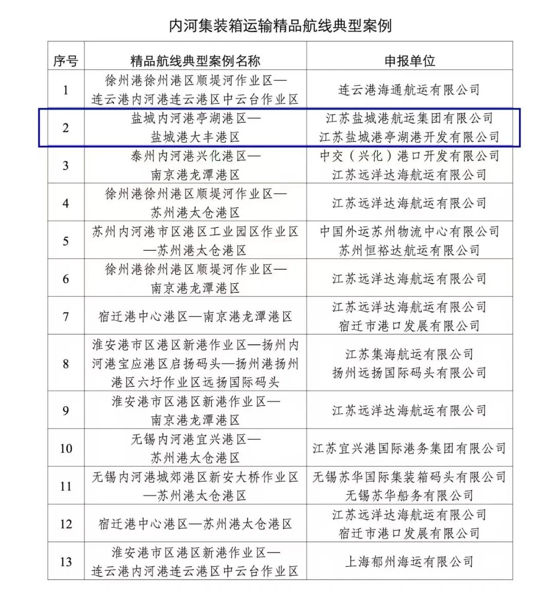 近日,省交通運(yùn)輸廳發(fā)布《內(nèi)河集裝箱運(yùn)輸精品航線典型案例》,航運(yùn)集團(tuán)自營的鹽城內(nèi)河港亭湖港區(qū)—鹽城港大豐港區(qū)內(nèi)河集裝箱精品航線憑借出色的運(yùn)營表現(xiàn)和創(chuàng)新舉措,入選全省內(nèi)河集裝箱運(yùn)輸精品航線典型案例。