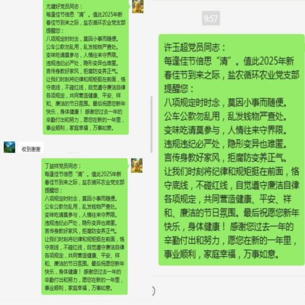 鹽農循環農業堅持早研究、早部署、早警示,以節前“廉”動為抓手,持續營造風清氣正的節日氛圍,節前發送廉潔提醒短信,將警示提醒融入溫馨祝福之中引導全體黨員干部、群眾把好“廉潔關”繃緊“廉潔弦”。