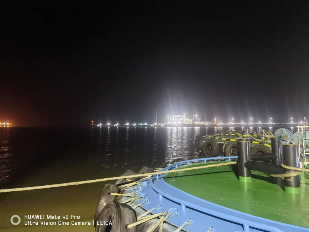 面對“晨昏蒙影”特殊時段(黎明前光線昏暗期),引航員提前1小時登輪,與船長反復(fù)核對潮汐、流速和船舶操縱特性。在朝陽初升的關(guān)鍵窗口期,引航員通過精準(zhǔn)操控,在大馬力拖輪協(xié)同配合下,克服船舶慣性、風(fēng)流壓差等技術(shù)難點完成精準(zhǔn)靠泊。