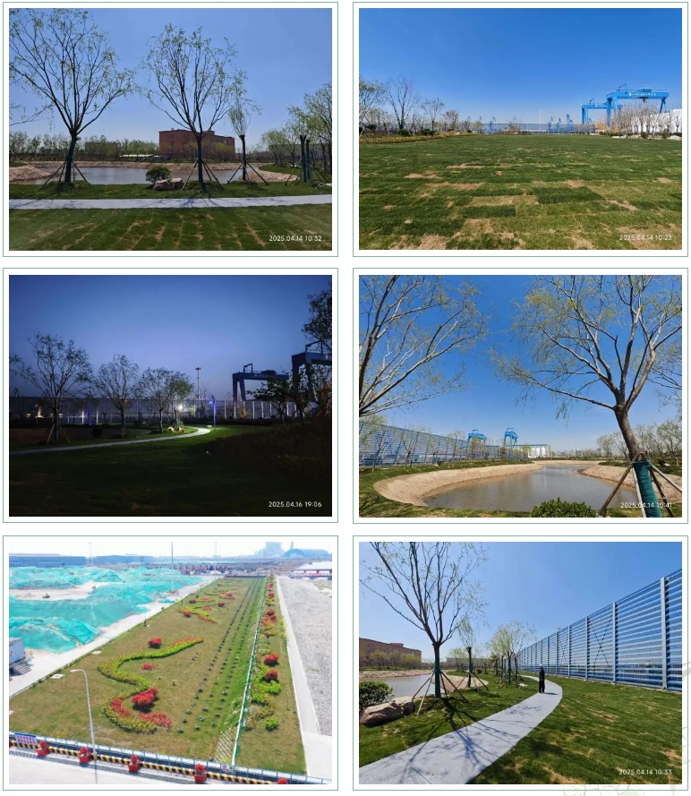 依托科學規劃,利用自有苗圃中的喬木、灌木及地被植物,建設錯落有致的立體綠化景觀,改善港口工作生活環境。按流體力學原理設計:40%透風孔隙率、0.6風速衰減系數,形成梯度式生態屏障,防風林帶與景觀花徑相交織,長成后將有效實現"抑塵+降噪+碳匯"三重效能,為港口披上“生態外衣”,實現生產與自然的和諧共生。