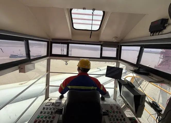 抓斗起落在數(shù)十米的高空中劃出流暢弧線,鋼齒咬合的瞬間,貨物簌簌滑落,門機(jī)室的玻璃接住了陽(yáng)光拋來(lái)的金線,織進(jìn)了門機(jī)工的工裝里。他們心無(wú)旁騖,雙手穩(wěn)如磐石,憑借毫米級(jí)的操作精度,滿載時(shí)控制抓斗勻速下沉,避免貨物散落;空載時(shí)調(diào)整角度規(guī)避障礙物,確保設(shè)備與人員安全,全力提升港區(qū)貨物吞吐量,為港區(qū)完成年度目標(biāo)任務(wù)貢獻(xiàn)力量。