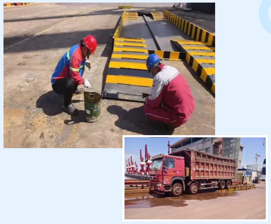 成果展示:該平臺結構簡單實用,通過循環水系統對進出港口的運輸車輛進行全方位沖洗,確保車輛干凈整潔,進一步提升運輸全程的環保水平,減少車輛帶泥上路和揚塵污染。自制洗車平臺投入使用后,不僅節省了采購成本,而且減少了50%的道路打掃頻次,極大地降低了人力成本。