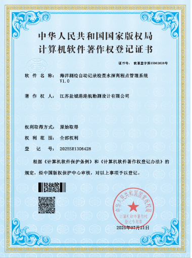 近日,勘測設(shè)計公司經(jīng)國家版權(quán)局審核,獲一項計算機軟件著作權(quán)登記證書,為《海洋測繪自動記錄檢查水深高程點管理系統(tǒng)V1.0》。