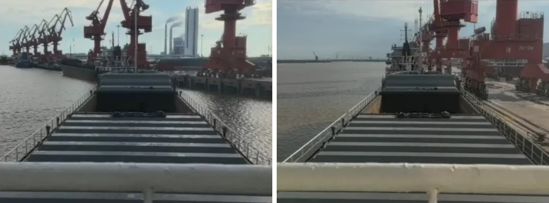 為確保船舶能夠在無拖輪的情況下安全靠港,引航員在充分結合碼頭的生產調度現狀的基礎上,根據引航手持設備,直觀水文條件與航道情況,為避免低平潮淺水效應,根據船舶特性,利用風流壓與車、舵、錨、纜相結合,采用拋錨拉大角度船頭靠泊的方式進港,在引航員精湛的技藝之下,船尾與泊位周邊浮筒擦肩而過,完美地進入碼頭范圍。在主控室中,不斷下達車速與舵角的操作指令,在湍急的岸邊水流中不斷拉扯船舶與碼頭的位置,最終在碼頭工人拉緊最后一根纜繩的同時完成本次靠港任務。