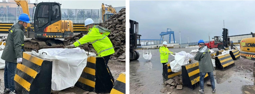在接到這一“急單”后,響水港區迅速響應,立即著手制定詳細作業計劃,作業計劃明確到各個環節責任人和時間節點。在面對港區現有資源匱乏的困境,生產組副組長顧海偉挺身而出,向客戶和領導立下軍令狀,保證按時完成緊急任務。港區積極協調各類機械和人員調配,在港區機械有限的情況下,從社會各界連夜聯系租用挖機,同時組建了一支臨時灌裝“作戰隊伍”。